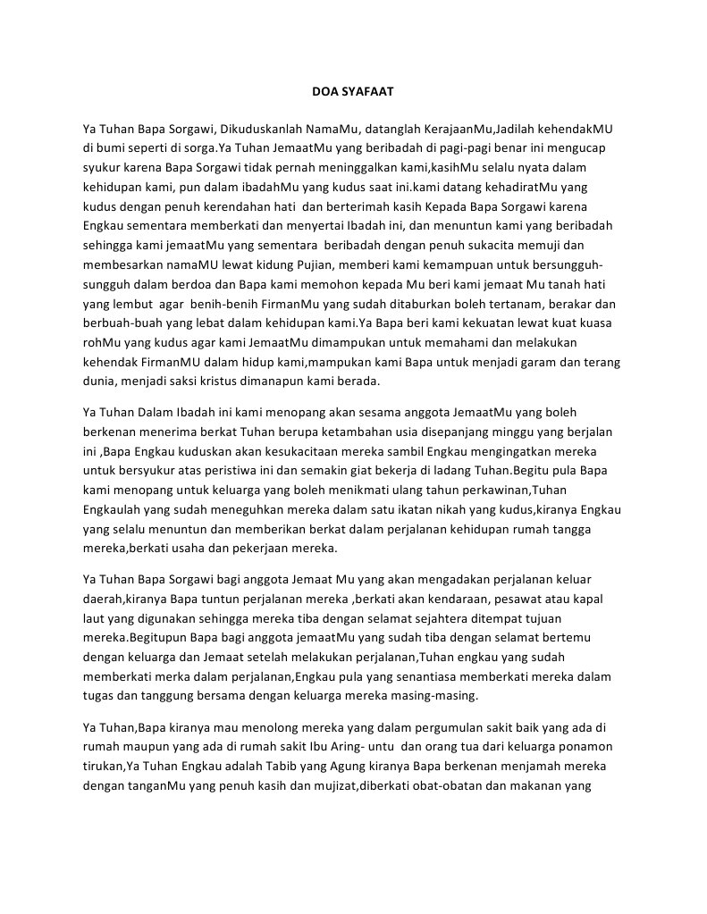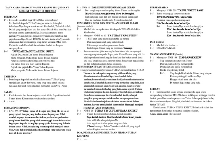 Tata Ibadah Gereja Masehi Injili Di Timor Gmit Ibadah Minggu 21 Jan 2018 Model Ii Pembesukan Pdf Document from demo.vdocuments.mx Baik itu laki laki pemuda remaja maupun orang dewasa. Dibawa ini adalah contoh doa syafaat kristen ibadah kaum perempuan: Jadi, doa syafaat akan dibawakan saat acara ibadah umat kristiani berlangsung. Baik saat ibadah di gereja, ibadah hari minggu, ibadah rumah tangga, ibadah kaum ibu dan ibadah pada hari lainnya, umat kristien selalu membacakan doa syafaat di awal acara. Dan biarlah kasih sukacita dan damai sejahtera tuhan selalu hadir dalam kehidupan kita. Terimakasih tuhan, didalam nama tuhan yesus kami berdoa. Pada hari ini kami boleh mengucap syukur dapat berkumpul di tempat ini untuk memuji dan memuliakan namamu. Ibadah kaum pria atau kaum bapak dilakukan di gereja atau bisa juga di rumah.